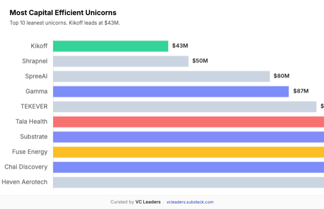Only 5 companies in the entire class show disclosed funding below $100M: Kikoff ($42.5M), Shrapnel ($50M), SpreeAI ($80M), Gamma ($87M), and TEKEVER ($97.2M). And even this list deserves an asterisk. Kikoff, which sits at the bottom with $42.5M in disclosed funding across 4 rounds, has not yet disclosed the size of the round that made it a unicorn. When that number surfaces, it will almost certainly push the company well above the $100M mark. The same logic applies to others on this list — when companies appear “lean,” it’s often a matter of timing and disclosure, not genuine capital efficiency.