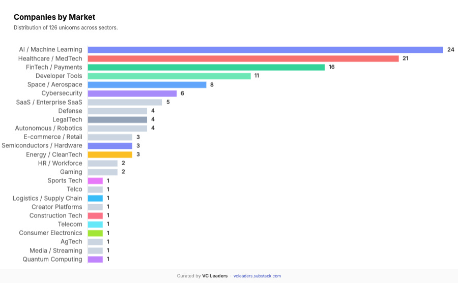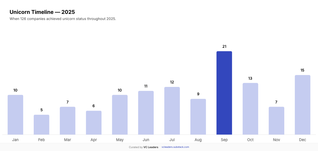 A fun fact: September 2025 was the peak month with 21 new unicorns announced, followed by December (15), October (13), and July (12). This aligns with typical Q3/Q4 funding cycles and year-end portfolio construction.