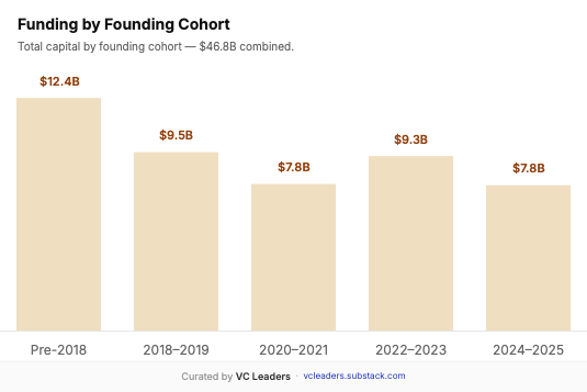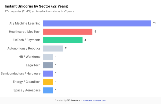 Speaking of the devil, 27 companies (21.4%) achieved unicorn status in ≤2 years from founding, collectively raising $13.1B in total. The 2024-2025 cohort raised an average of $553M (significantly above the overall average) while reaching unicorn status in under two years. This reflects a VC king-making strategy: bold bets on hot-space companies designed to outrun and discourage competition.