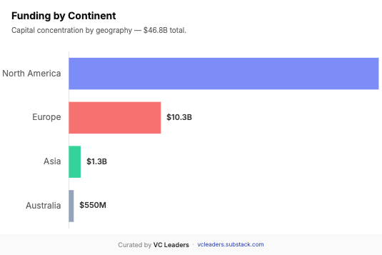 The US accounts for 73% of all 2025 unicorns. The UK leads Europe with 8 unicorns, followed by Germany with 5. Singapore notably punches above its weight with 4 unicorns from a small ecosystem. These geographic breakdowns are less meaningful for capital raised, since some of those companies migrated to the US following the availability of funding—so it wouldn't be fair to call them all American companies, though they are based in the US now.