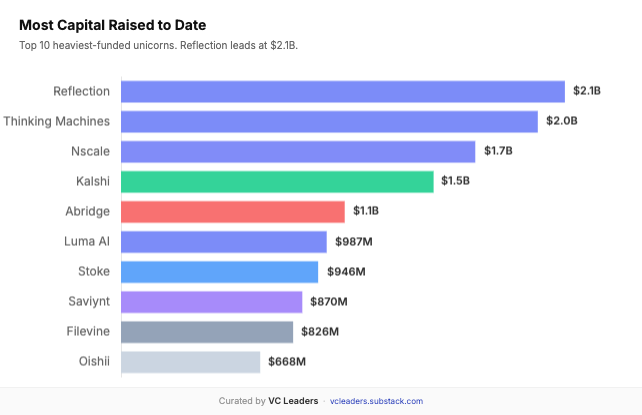 The clearest evidence of the capital concentration: Reflection ($2.13B) and Thinking Machines ($2B) both raised over $2B in their first year - the largest individual raises in the entire cohort. Rather than ask “is it an AI company” it makes more sense to ponder on “where does this company sit in the AI stack”?
