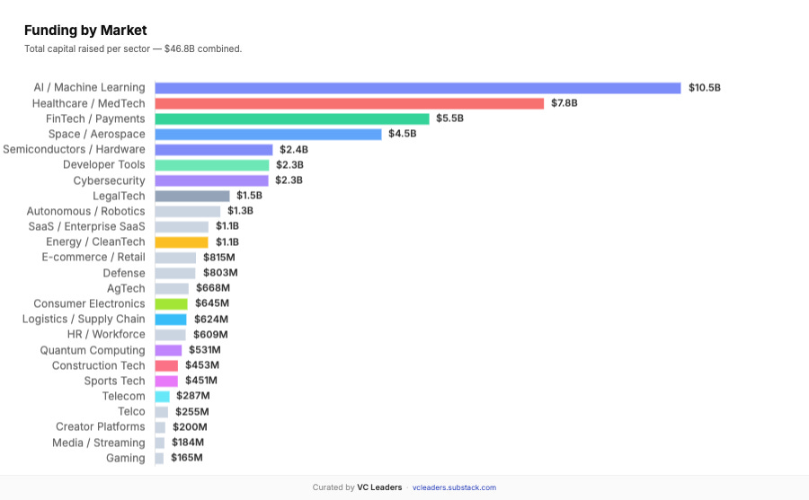 The space sector alone accounts for 8 unicorns and $4.5B in funding in total. This is driven by: reduced launch costs, growing demand for satellite data, and defense/national security applications.