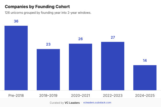 Notably, 36 companies (28%) in the 2025 unicorn class were founded in 2017 or earlier—these are "late bloomers" that took 8+ years to reach unicorn status. The COVID-era produced 26 unicorns but with lower average funding ($300M). The 2024-2025 cohort is smaller but received the largest average checks ($553M), reflecting concentrated bets on AI leaders.
